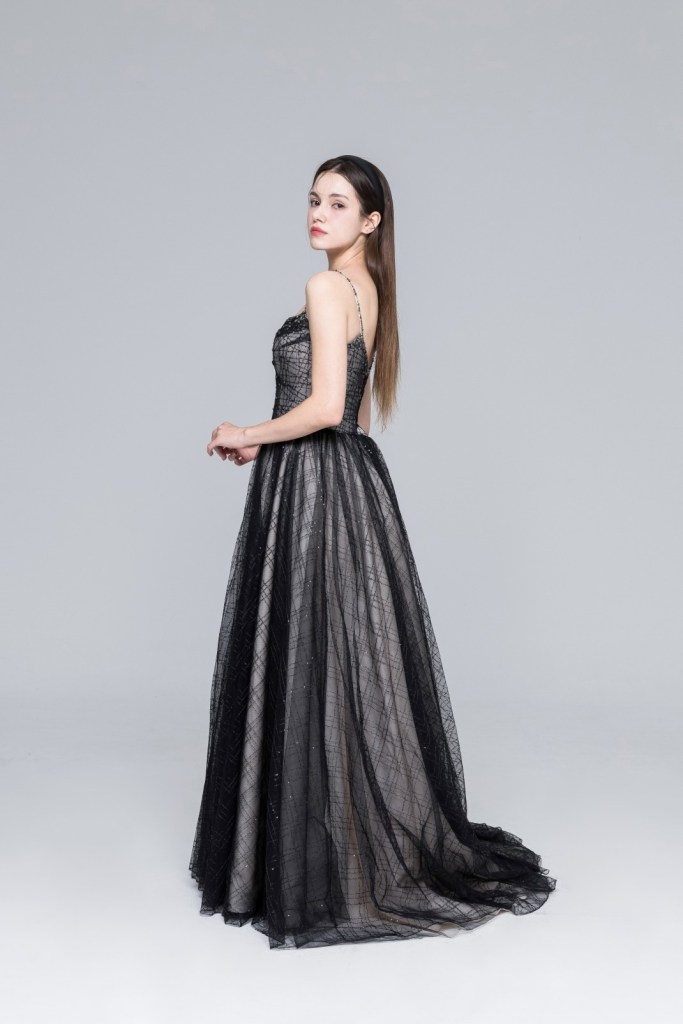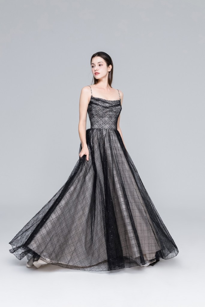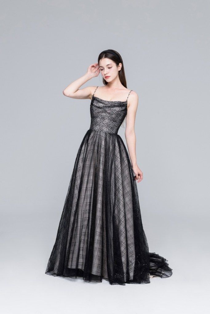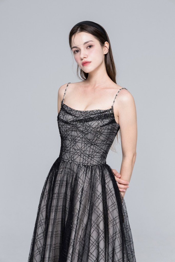 시크한 블랙 컬러 위에 은하수처럼 수놓아진 섬세한 글리터와 정교한 격자 패턴 레이스의 조화가 독보적인 아우라를 선사하며, 스파게티 스트랩의 간결한 라인이 세련되면서도 대담한 무드를 완성합니다.