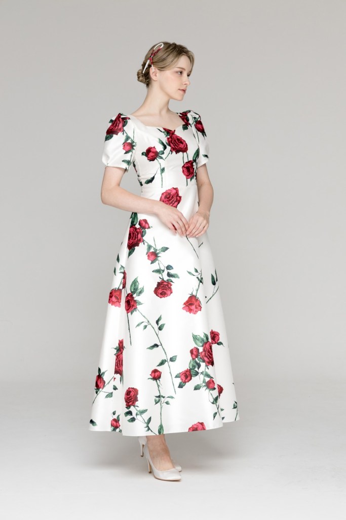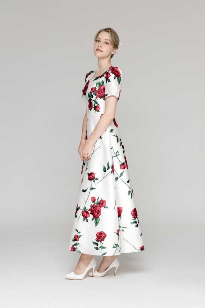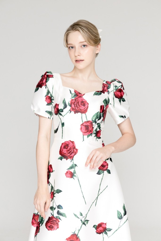 깨끗한 화이트 바탕 위로 대담하게 피어난 레드 로즈 패턴이 강렬한 예술적 감각을 선사하며, 부드러운 하트 스퀘어 네크라인과 로맨틱한 퍼프 소매가 조화를 이루어 한층 매혹적이고 우아한 실루엣을 완성합니다.