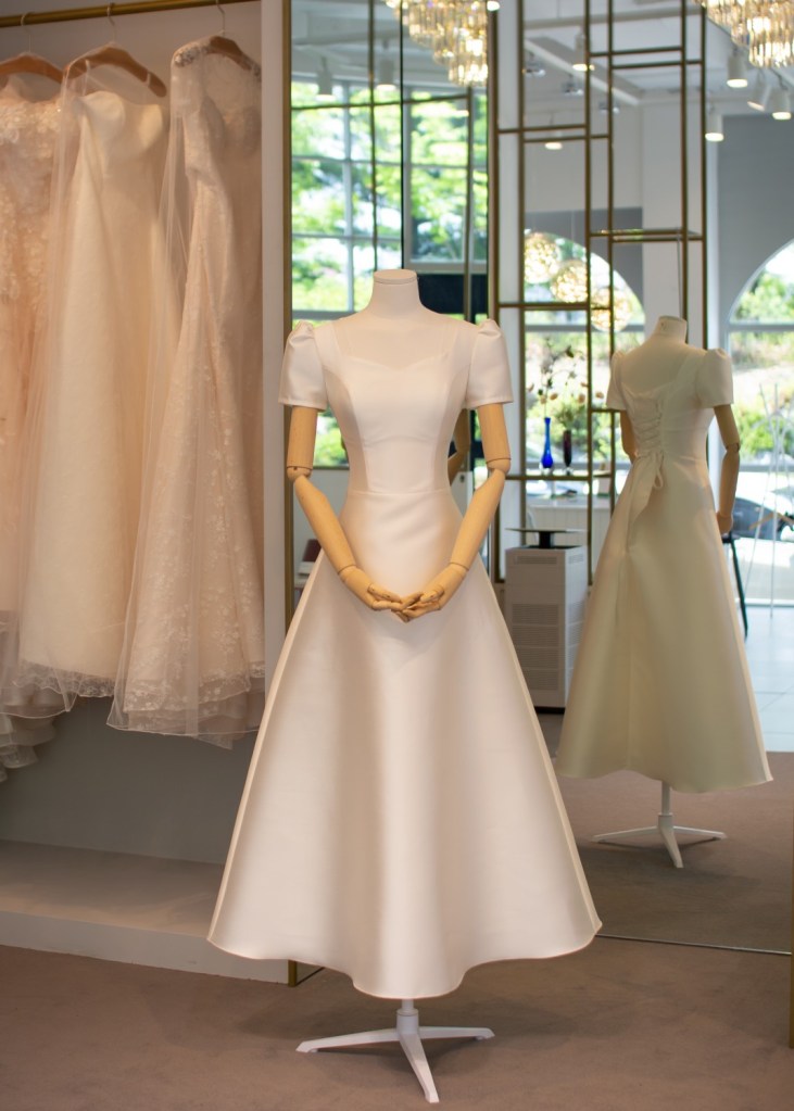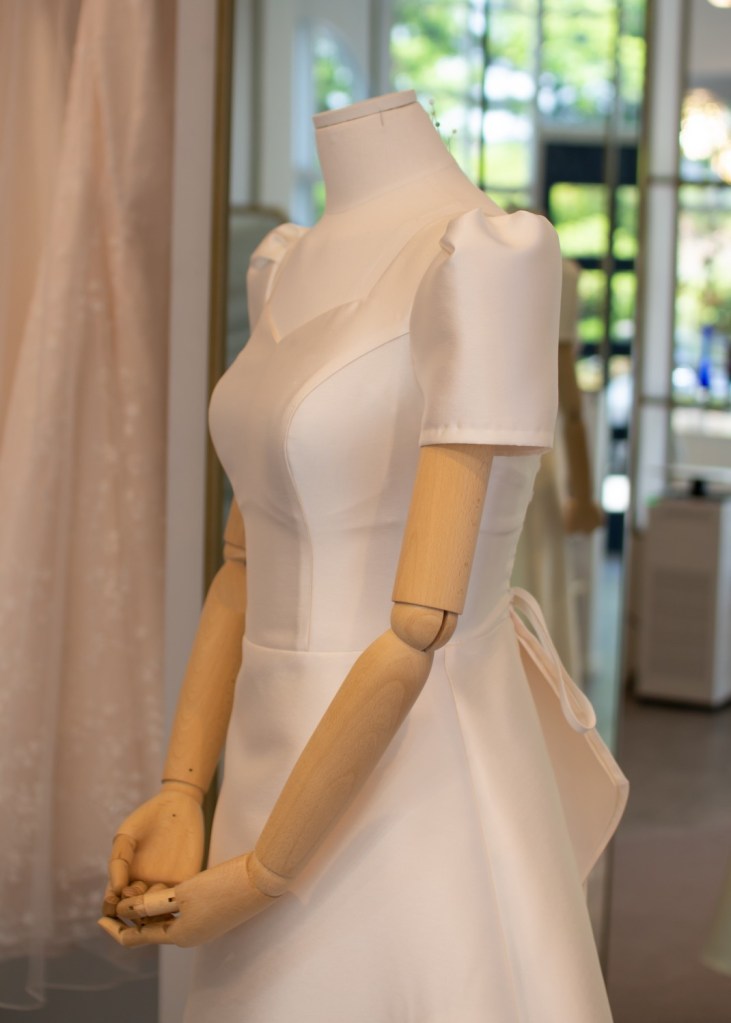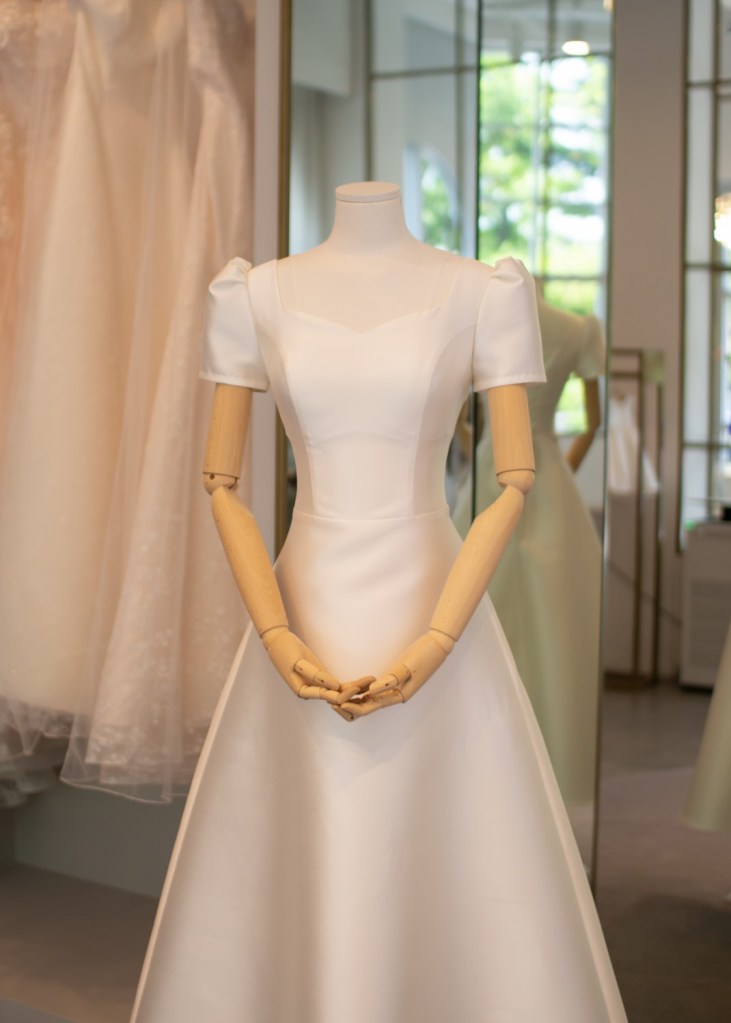 깨끗한 소재의 정갈함과 하트 네크라인의 부드러운 곡선미가 조화를 이루며, 어깨에 더해진 퍼프 소매의 볼륨감이 미디 길이의 A라인 실루엣과 어우러져 한층 세련되고 단아한 무드를 완성합니다.