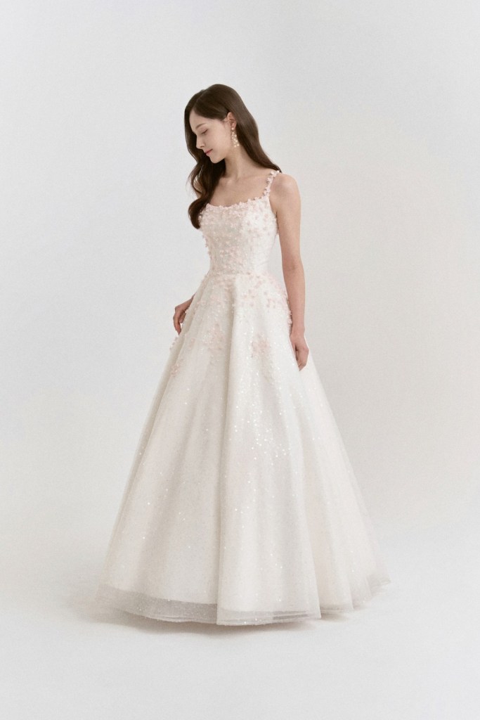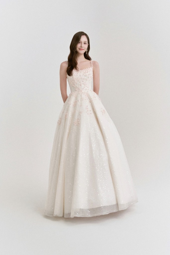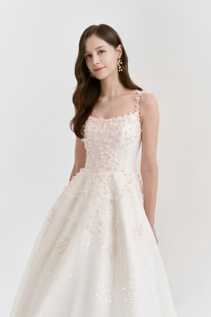 드레스 전체에 수놓아진 핑크빛 입체 꽃송이들이 화사함을 극대화하며, 맑고 투명한 원단 위로 흩뿌려진 스팽글이 움직임에 따라 신비롭게 반짝여 핑크 컬러 특유의 사랑스러운 실루엣을 완성합니다.