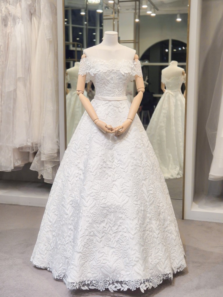 드레스 위로 촘촘히 피어난 잔잔한 꽃잎들이 신부님의 화사함을 극대화하며, 맑고 깨끗한 화이트 톤에 입체적인 레이스 자수가 더해져 청순하면서도 로맨틱한 무드를 완성합니다.