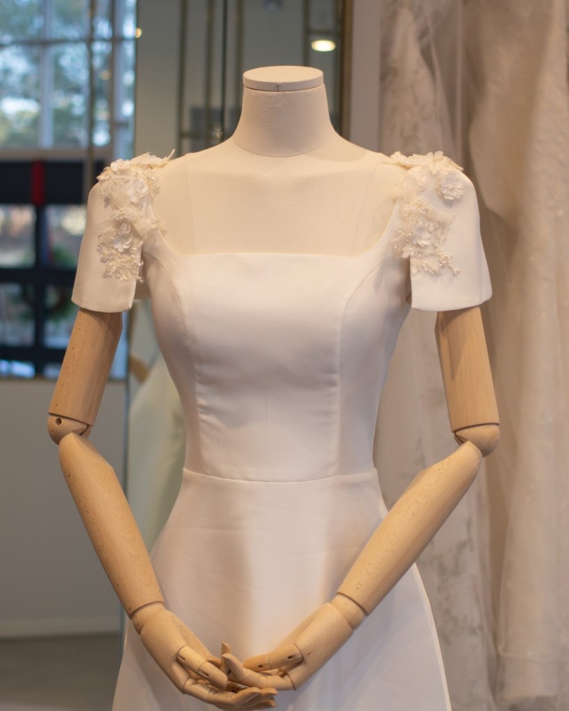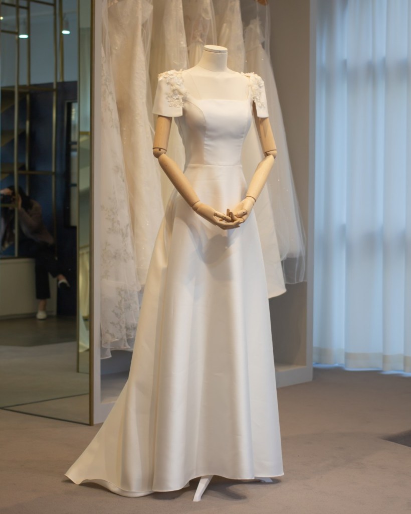 매끄러운 소재의 정갈함과 직선적인 스퀘어 네크라인이 조화를 이루며, 어깨 위를 수놓은 섬세한 플라워 모티프가 포인트가 되어 단아하면서도 고귀한 분위기의 실루엣을 완성합니다.