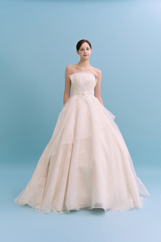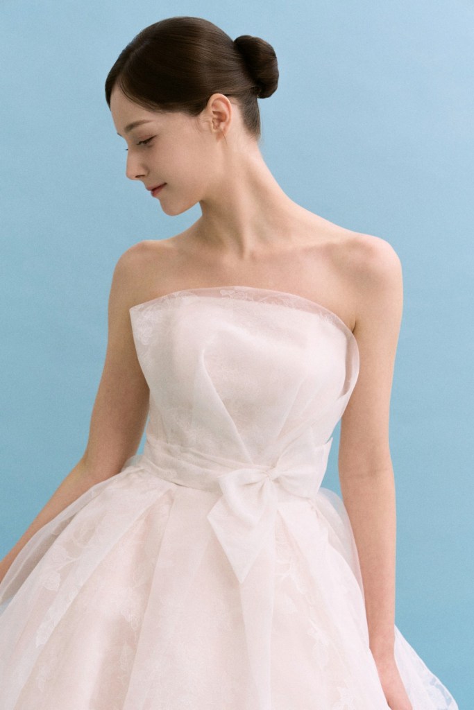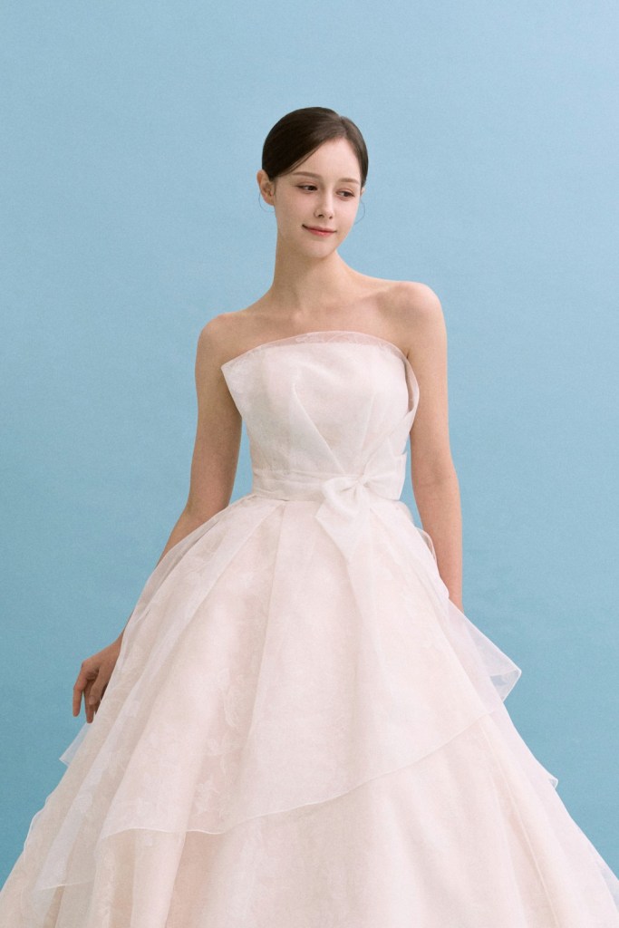 평온하고 맑은 분위기를 자아내며, 살구빛이 감도는 오묘한 페일 핑크 컬러와 가벼운 오간자 소재가 겹겹이 쌓여 완성된 입체적인 실루엣이 신부님을 더욱 화사하게 밝혀줍니다. 과한 비딩 없이도 소재가 주는 고급스러운 텍스처만으로 청순한 주인공의 아우라를 완성하고 싶은 분들께 권해드립니다.