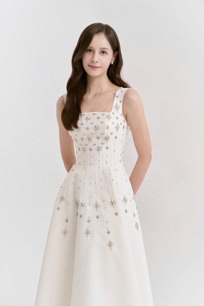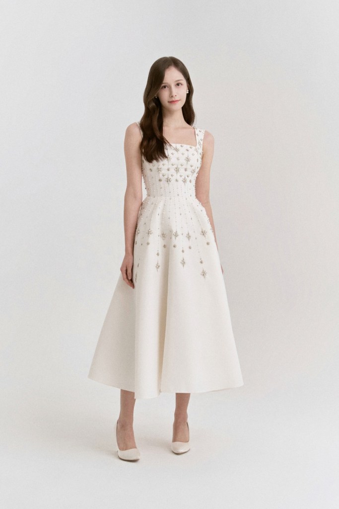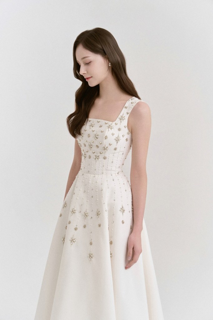 - 상체에 집중된 별 모양의 비딩 패턴이 스커트 아래로 자연스럽게 흐르듯 배치되어 시선을 위로 끌어주며, 전체적인 A라인 실루엣이 다리를 길어 보이게 하는 효과를 줍니다.