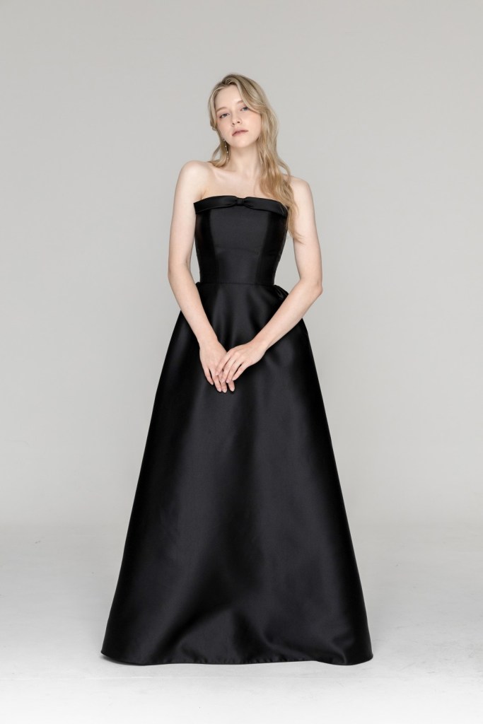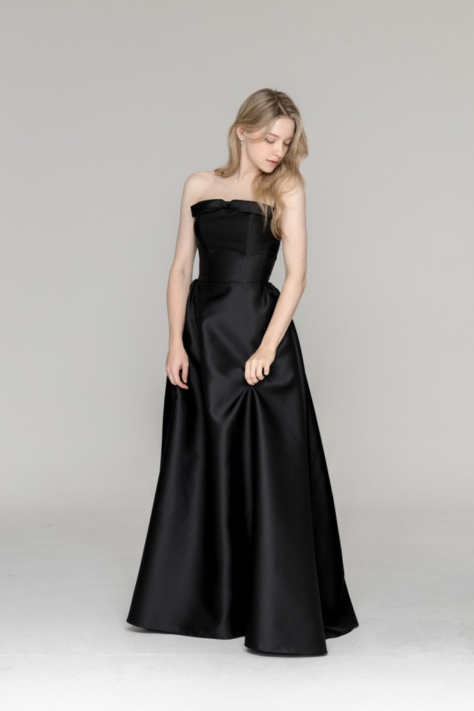 깊이 있는 블랙 컬러와 묵직한 소재가 자아내는 압도적인 세련미가 돋보이며, 정갈한 튜브톱 라인에 더해진 절제된 디테일이 현대적인 기품과 조화를 이루어 우아한 실루엣을 완성합니다.