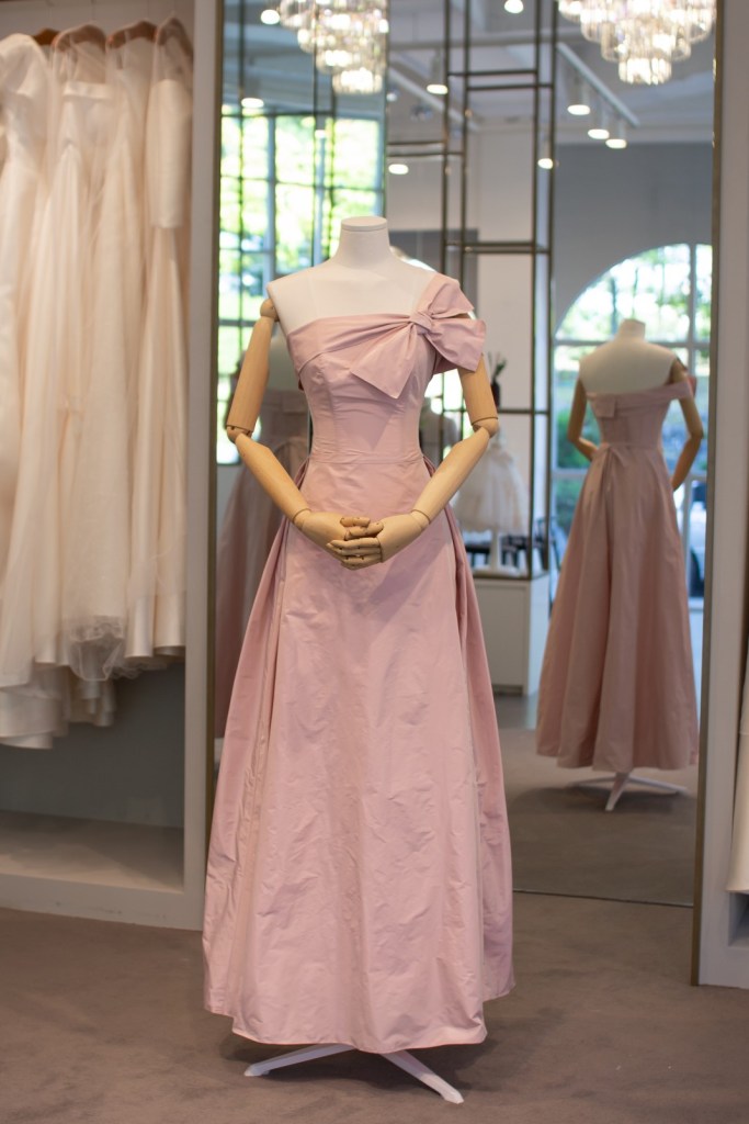 우아하고 세련된 더스티 핑크 컬러가 매력적이며, 흔치 않은 원숄더 실루엣과 볼륨감 있는 리본 장식이 유니크하면서도 로맨틱한 분위기를 완성합니다.