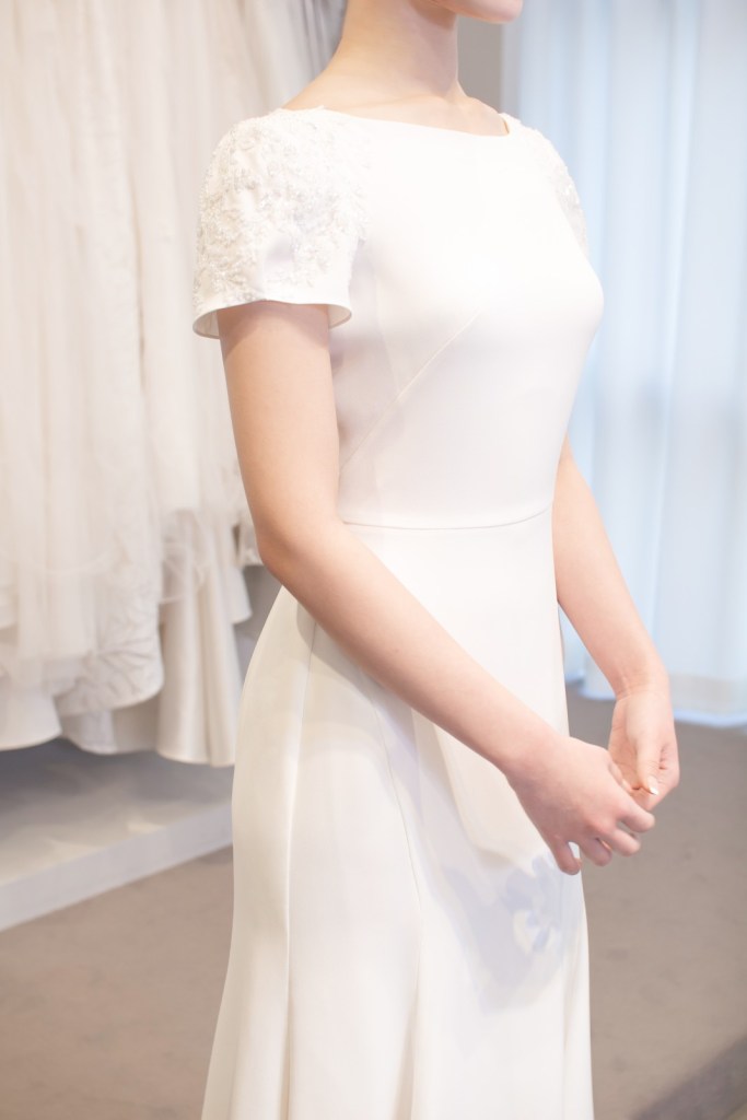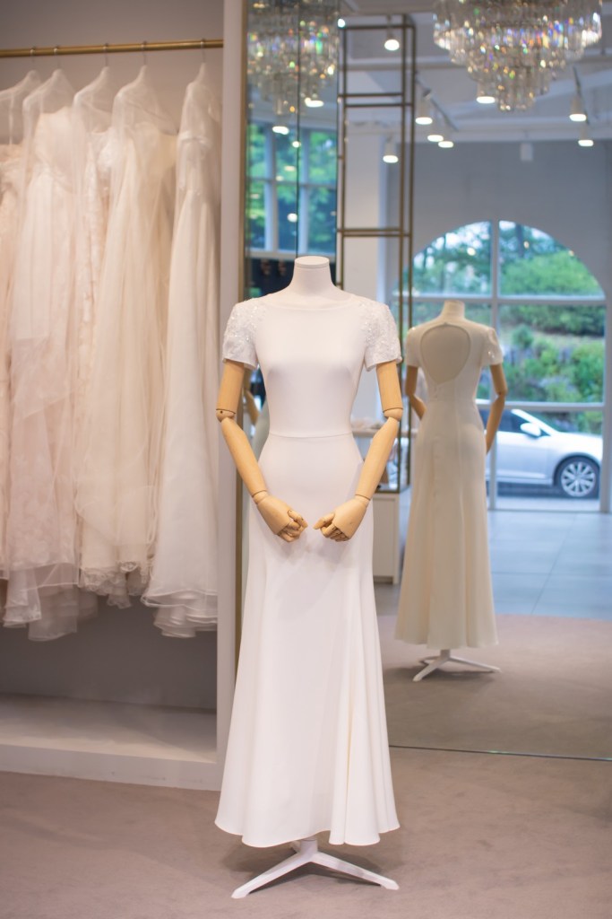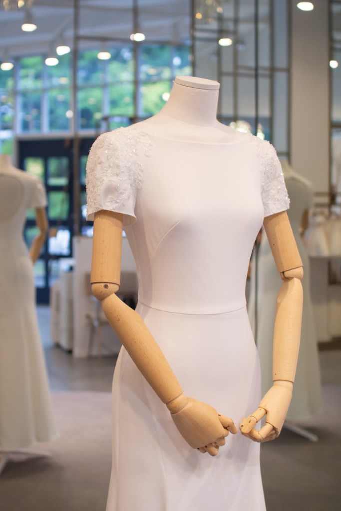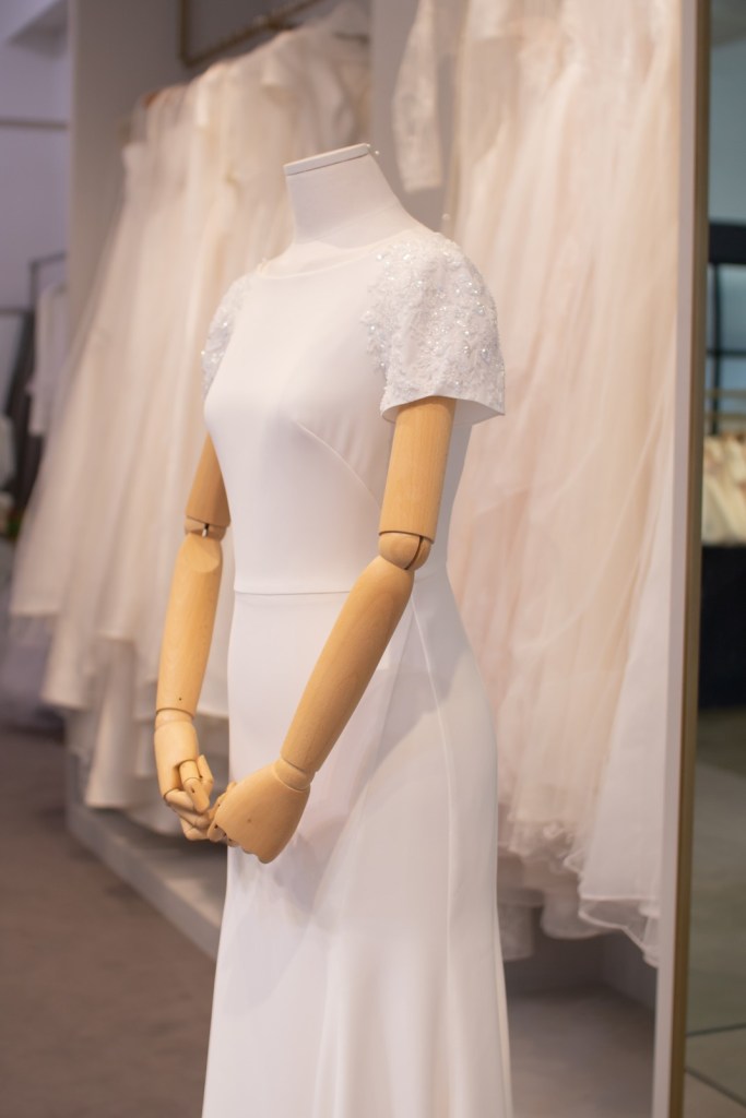 - 특히 어깨 부분에 집중된 화려한 비딩 장식은 시선을 상체로 끌어올려 신부님의 얼굴을 더욱 화사하게 밝혀주며, 별도의 액세서리 없이도 충분히 기품 있는 웨딩 룩을 완성해 줍니다.