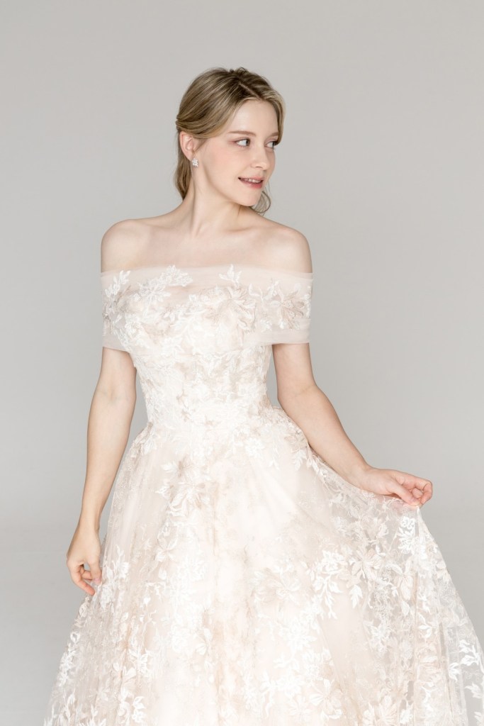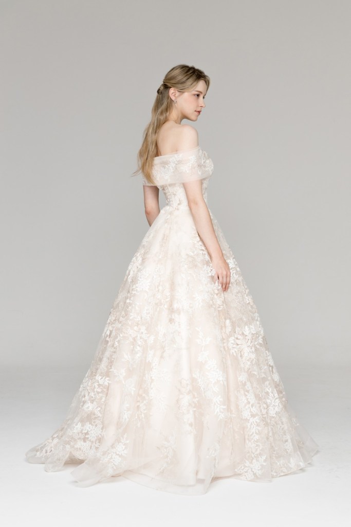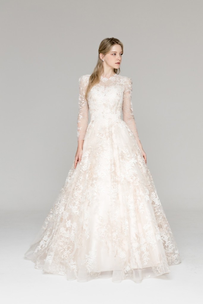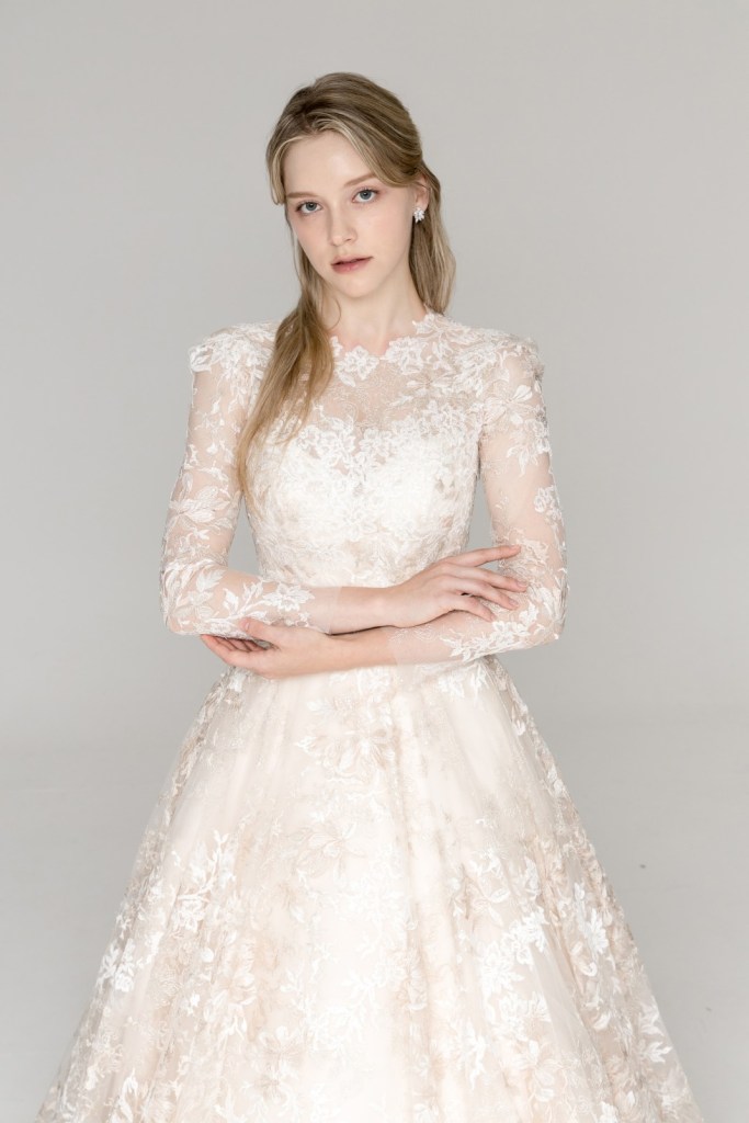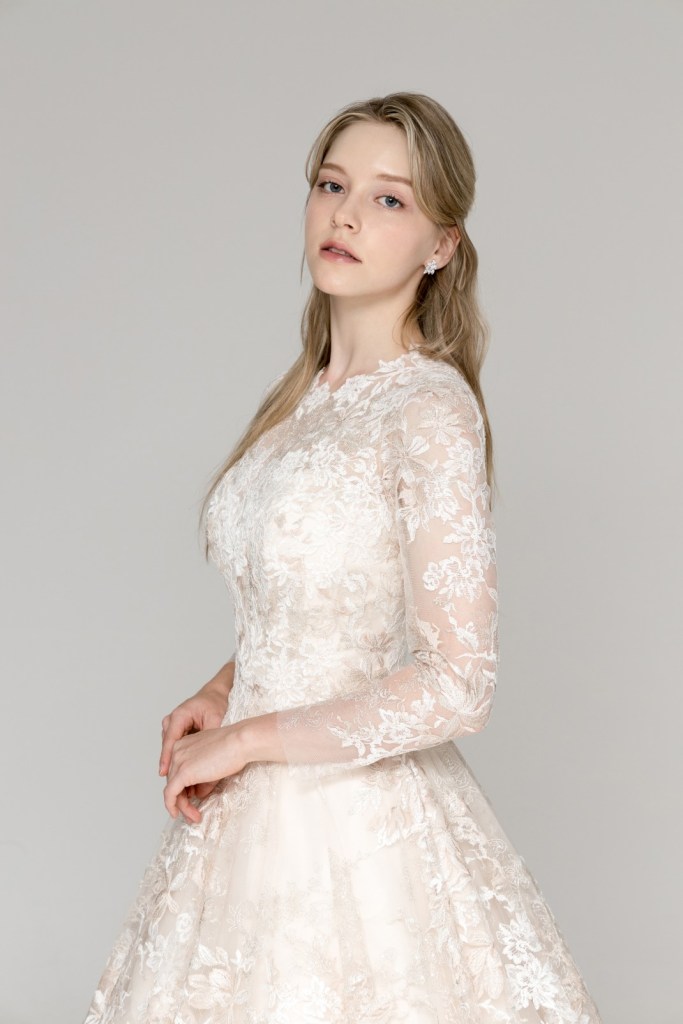 일반적인 화이트 톤과는 차별화된 깊이 있는 베이지 컬러가 돋보이며, 드레스 전체를 빈틈없이 채운 레이스 디테일이 클래식한 우아함의 정수를 보여줍니다. 신부님의 피부 톤을 더욱 따뜻하고 고급스럽게 만들어 주어, 성당 예식이나 고즈넉한 한옥 웨딩처럼 무게감 있는 장소에서 더욱 빛을 발할 특별한 선택이 되어줍니다.