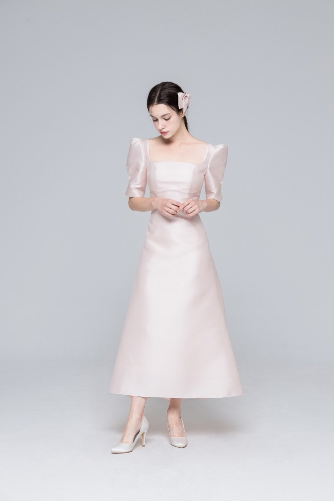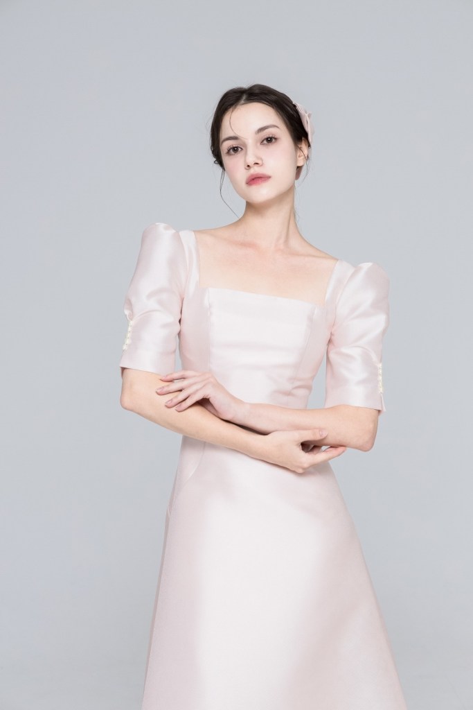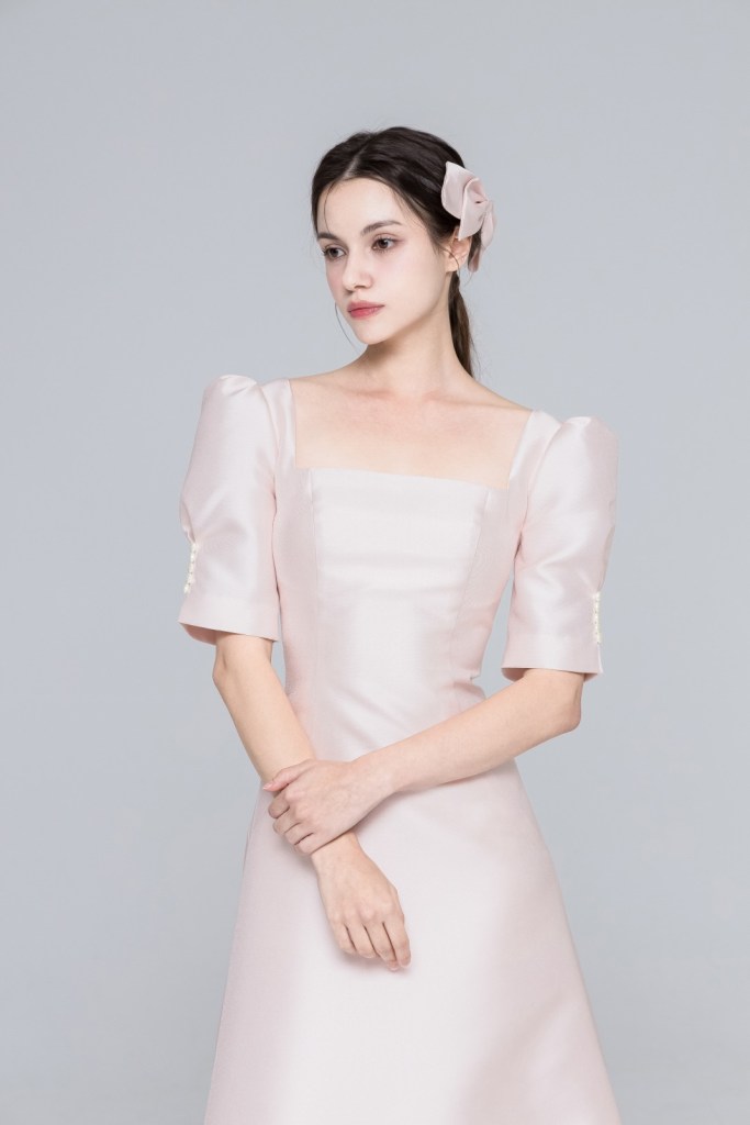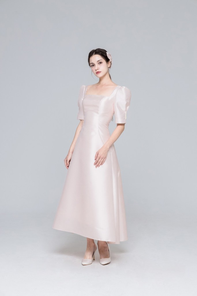 은은한 핑크빛이 감도는 소재 본연의 고급스러운 질감과 정갈한 스퀘어 네크라인이 조화를 이루며, 입체적인 퍼프 소매의 볼륨감이 미디 길이의 A라인 실루엣과 어우러져 한층 우아하고 사랑스러운 분위기를 완성합니다.