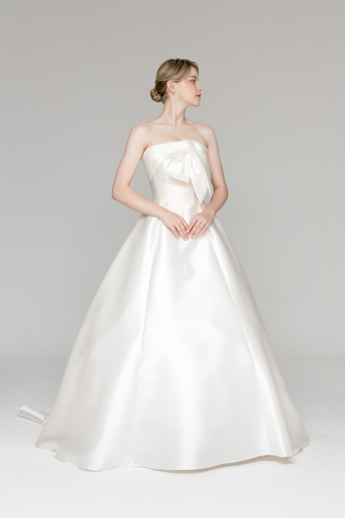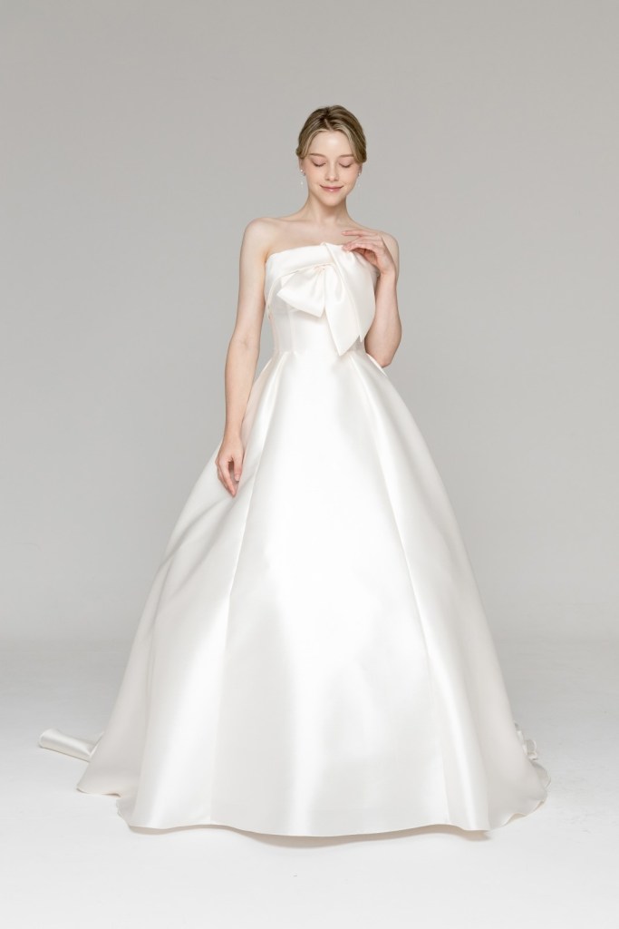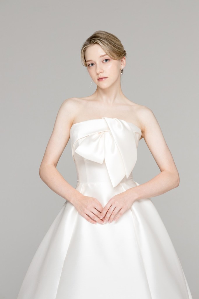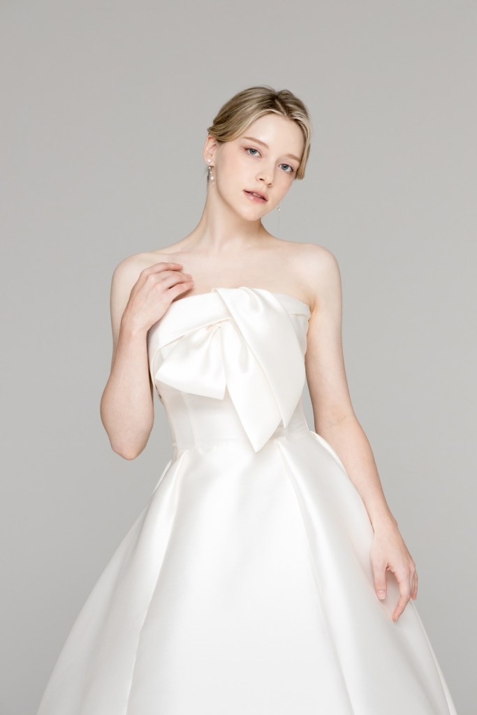 - 어깨와 쇄골 라인을 과감하게 드러내는 스트랩리스 디자인과 상체의 입체적인 빅 리본 디테일이 특징입니다.