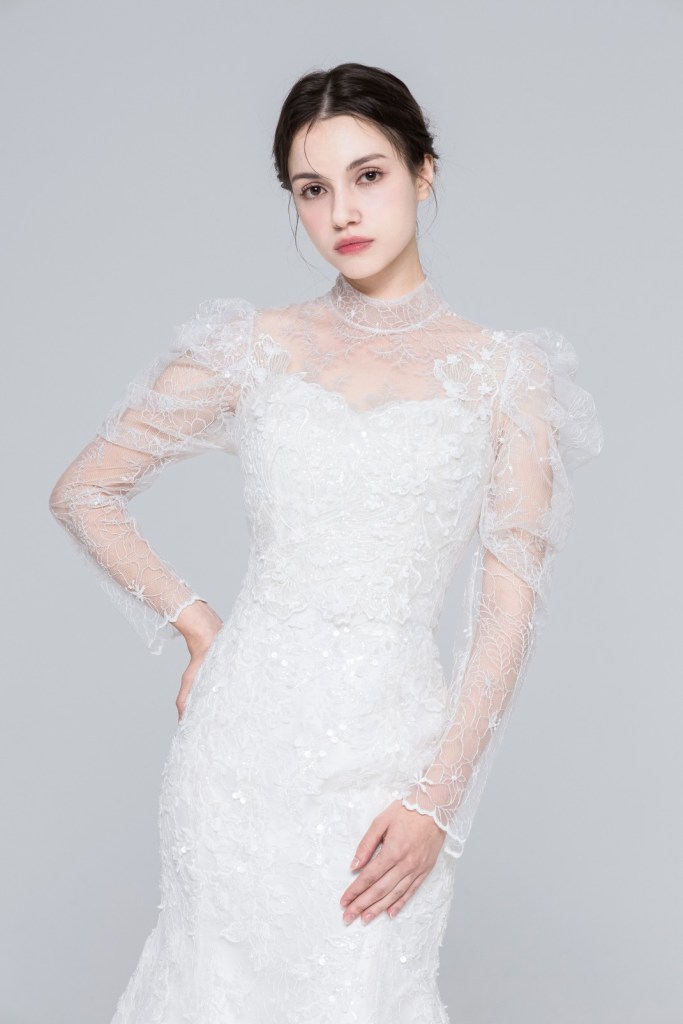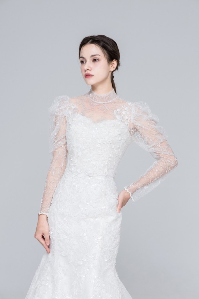 드레스 전체를 수놓은 섬세한 레이스 패턴이 고결한 분위기를 자아내며, 시스루 레이스 너머로 비치는 은은한 무드와 입체적인 자수 디테일이 조화를 이루어 화려하면서도 기품 있는 웨딩 룩을 완성합니다. 클래식한 무드의 채플 웨딩이나 프라이빗한 하우스 웨딩에서 더욱 빛을 발할 특별한 선택이 되어줍니다.