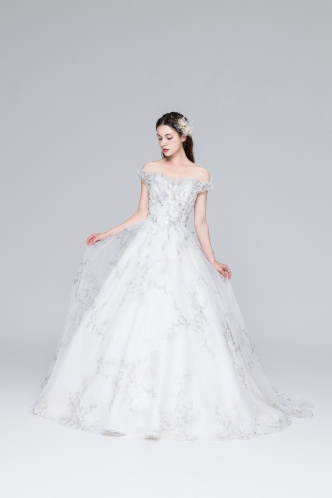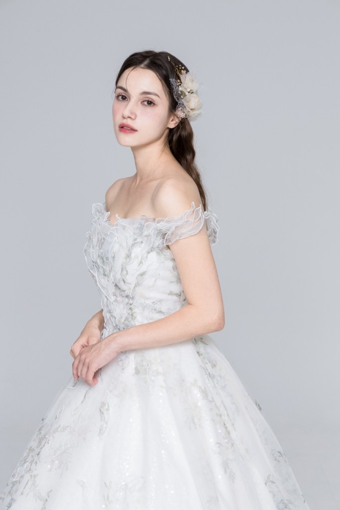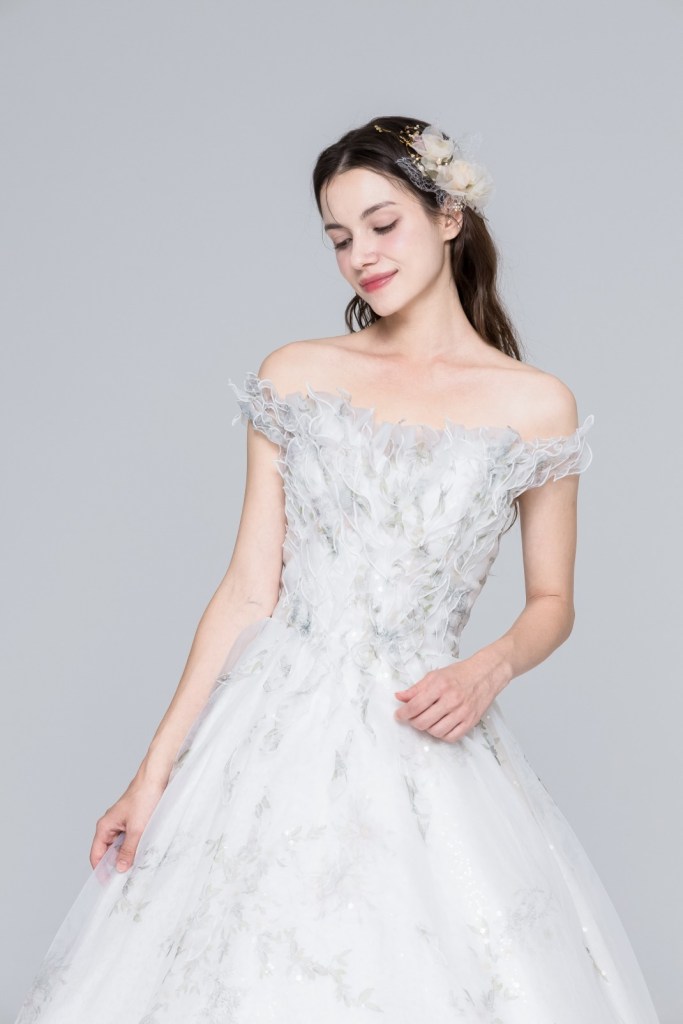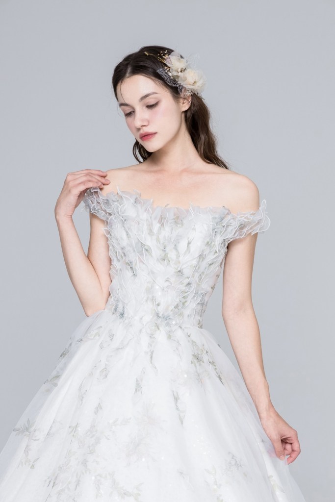 마치 숲속의 정원을 드레스 위에 옮겨 놓은 듯 섬세한 꽃잎들이 겹겹이 피어났으며, 화이트 베이스에 은은하게 감도는 보태니컬 무드가 신비로운 느낌을 더해 몽환적이면서도 로맨틱한 분위기를 완성합니다. 흔치 않은 유니크한 디테일로 신부님의 특별한 날을 더욱 동화처럼 빛내주는 선택이 되어줍니다.