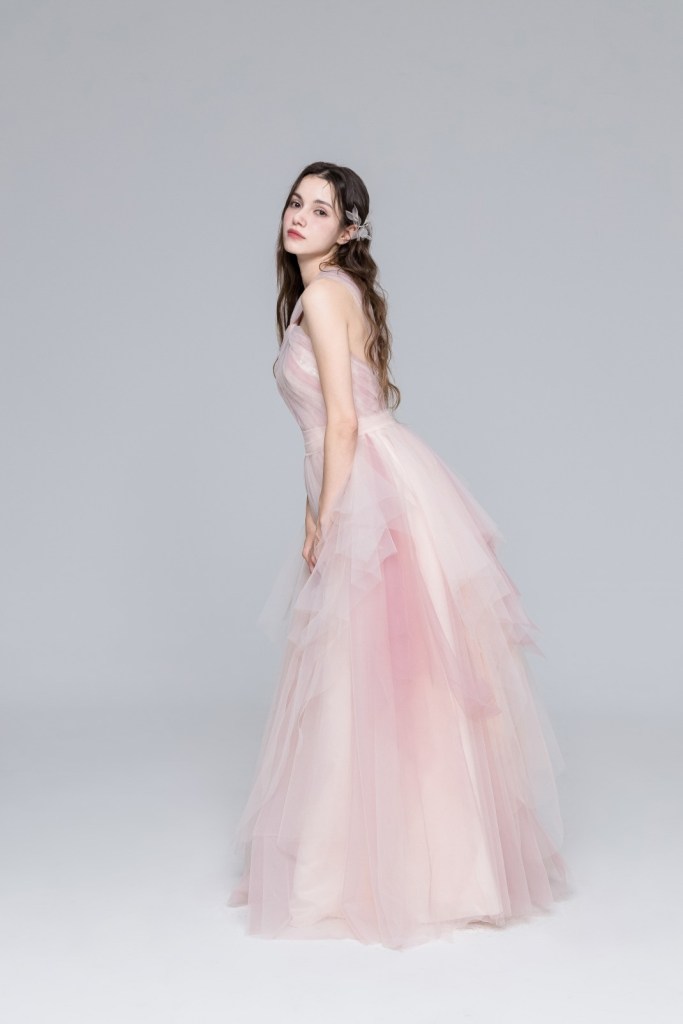 부드러운 피치 핑크 컬러의 색감과 가벼운 튤 소재가 겹겹이 쌓인 입체적인 실루엣이 돋보이는 드레스입니다. 어깨 라인을 감각적으로 가로지르는 홀터넥 디자인이 세련미를 더하며, 층층이 결을 살린 스커트 라인이 움직임마다 몽환적인 분위기를 자아냅니다.